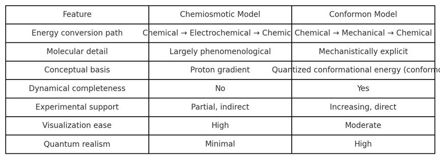 - Simplicity Bias: The chemiosmotic model is visually easier to depict in diagrams and animations. In contrast, the conformon model requires understanding of more advanced concepts in quantum mechanics, conformational dynamics, and enzymology.
