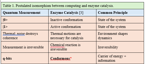 From a thermodynamic perspective, quantum measurement and enzyme catalysis share a structural isomorphism. Both involve selection among alternatives, irreversibility, and dissipative stabilization [12]. Based on this view, we now explicitly postulate that q-bits and conformons [1, 2] are isomorphic carriers of energy and information, as indicated in the last row of Table 1.