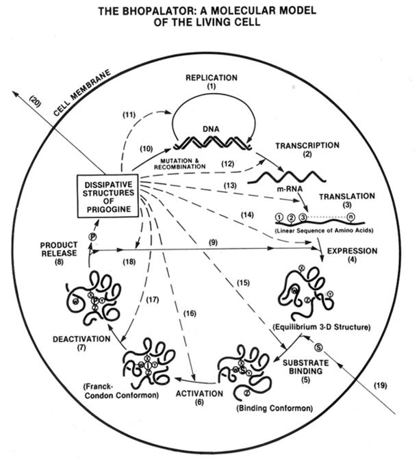 The Bhopalator consists of a total of 20 major steps: 1 = DNA replication; 2 = transcription; 3 = translation; 4 = protein folding; 5 = substrate binding; 6 = activation of the enzyme-substrate complex; 7 = equilibration between the substrate and the product at the metastable transition state; 8 = product release contributing to the formation of the intracellular dissipative structure (IDS); 9 = recycling of the enzyme; 10 = IDS-induced changes in DNA structure; 11 through 18 = feedback interactions mediated by IDS; 19 = input of substrate into the cell; and 20 = the output of the cell effected by IDSs, which makes cell function and IDSs synonymous (see Section 10.1 for more details). Reproduced from [3].