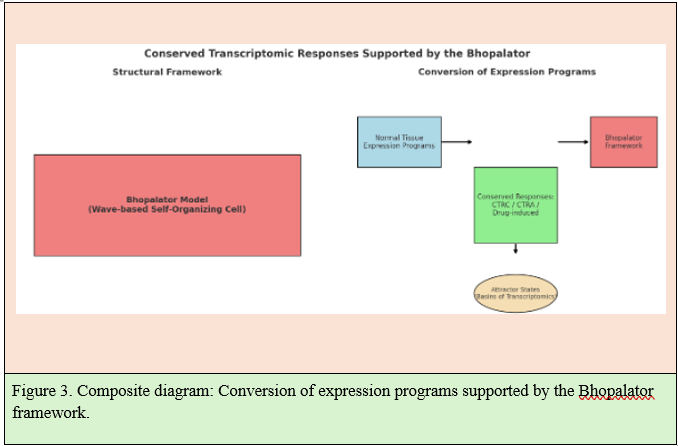 - Right panel: How normal tissue programs are converted into conserved responses (CTRC/CTRA/drugs), which in turn settle into attractor states—stable basins of transcriptomics supported by the Bhopalator.
