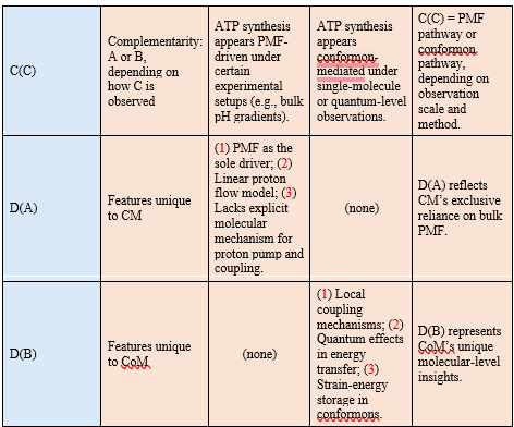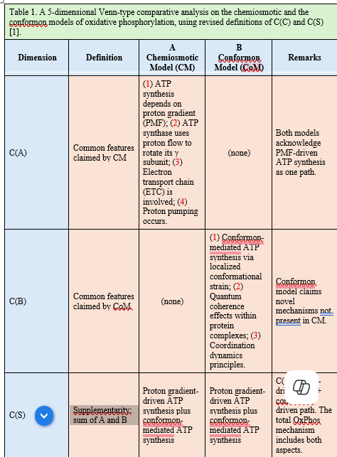 I had to revise the 5-dimensional Venn-type comparative analysis of the chemiosmotic and the conforman models of OxPhos published on July 15, 2025, because I had wrong definitions of C(S) and C(C). The revised Substack post is attached below and the net changes resulting therefrom are summarized in Table 20 below.