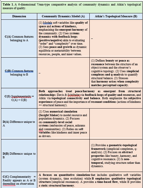 By comparing these two frameworks using a 6-Dimensional Venn-type Comparative Analysis (6VCA) [1] as shown in Table 1, we uncover how system dynamics (time-based evolution) and topological resonance (structural beauty) can complement one another in the study of peace and harmony.