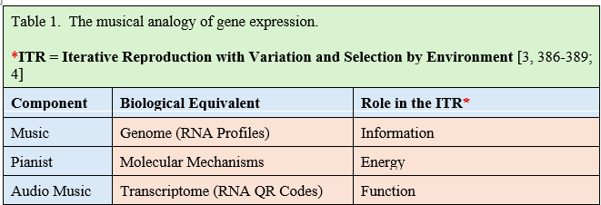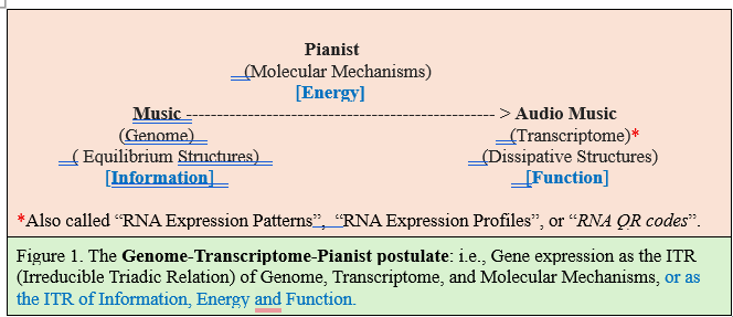 The Genome–Transcriptome–Pianist postulate depicted in Figure 1 can be summarized as shown in Table 1.