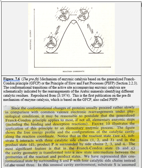 In 1974, I introduced an alternative framework, the pre-fit hypothesis, which has since gained renewed significance. Unlike induced-fit, the pre-fit mechanism argues that conformational changes of enzymes precede the rapid chemistry of bond-making and bond-breaking, guided by the Generalized Franck–Condon Principle. This principle, borrowed from quantum chemistry, states that when two processes of vastly different speeds are coupled, the slower process must occur first.