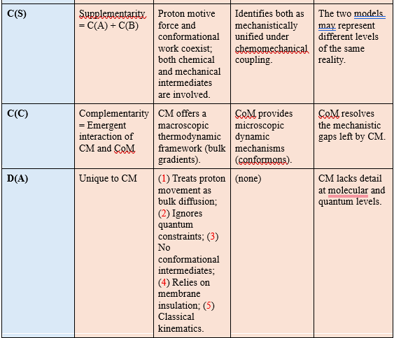 C(C) Complementarity: A or B, depending on how C is observed. ATP synthesis appears PMF-driven under certain experimental setups (e.g., bulk pH gradients). ATP synthesis appears conformon-mediated under single-molecule or quantum-level observations.