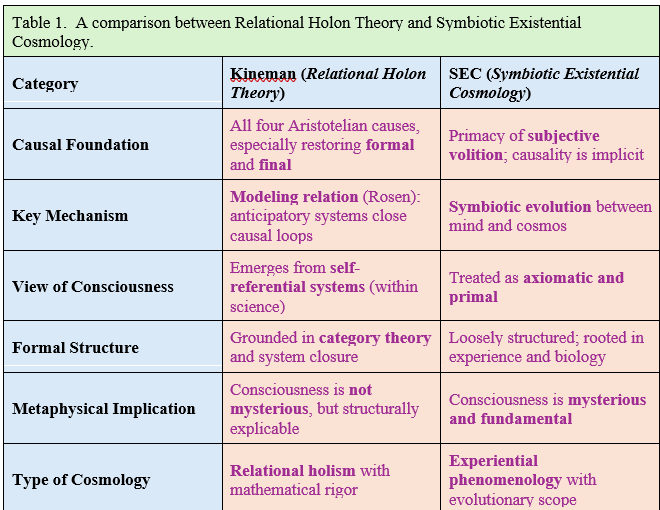 Both Kineman and SEC represent emergent cosmologies seeking to transcend the 20th-century materialist paradigm. Each addresses, in its own way, the unfinished business of modern science: how to account for meaning, consciousness, and purpose.