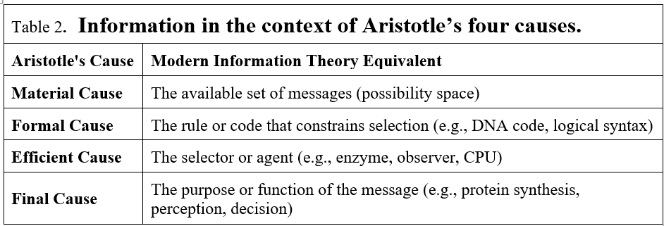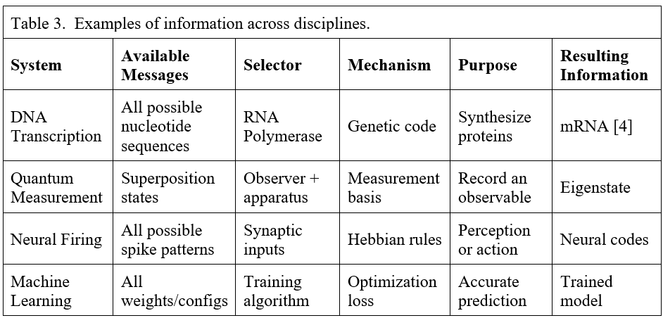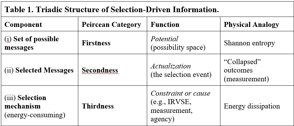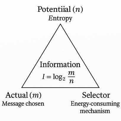 Let’s start from first principles. According to a revised formulation based on Shannon’s foundational work and enriched by biosemiotics, thermodynamics, and Aristotelian metaphysics, information emerges when a system selects from a set of possible messages [2].