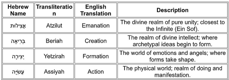 These worlds correspond to stages in the descent of divine energy from the Infinite into the material realm, and they also align aspects of the human soul, the sefirot, and spiritual development. This resembles descriptions in quantum physics discussed by Schipper, H. M. (2025) in “Bohmian Mechanics and the Kabbalah.” This panentheistic view is well covered in Seekers of Unity (2021). “God of the Kabbalists - Pantheism & Kabbalah”
